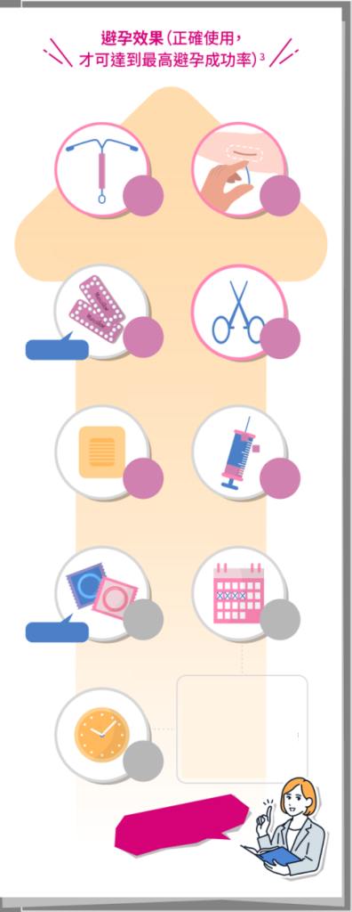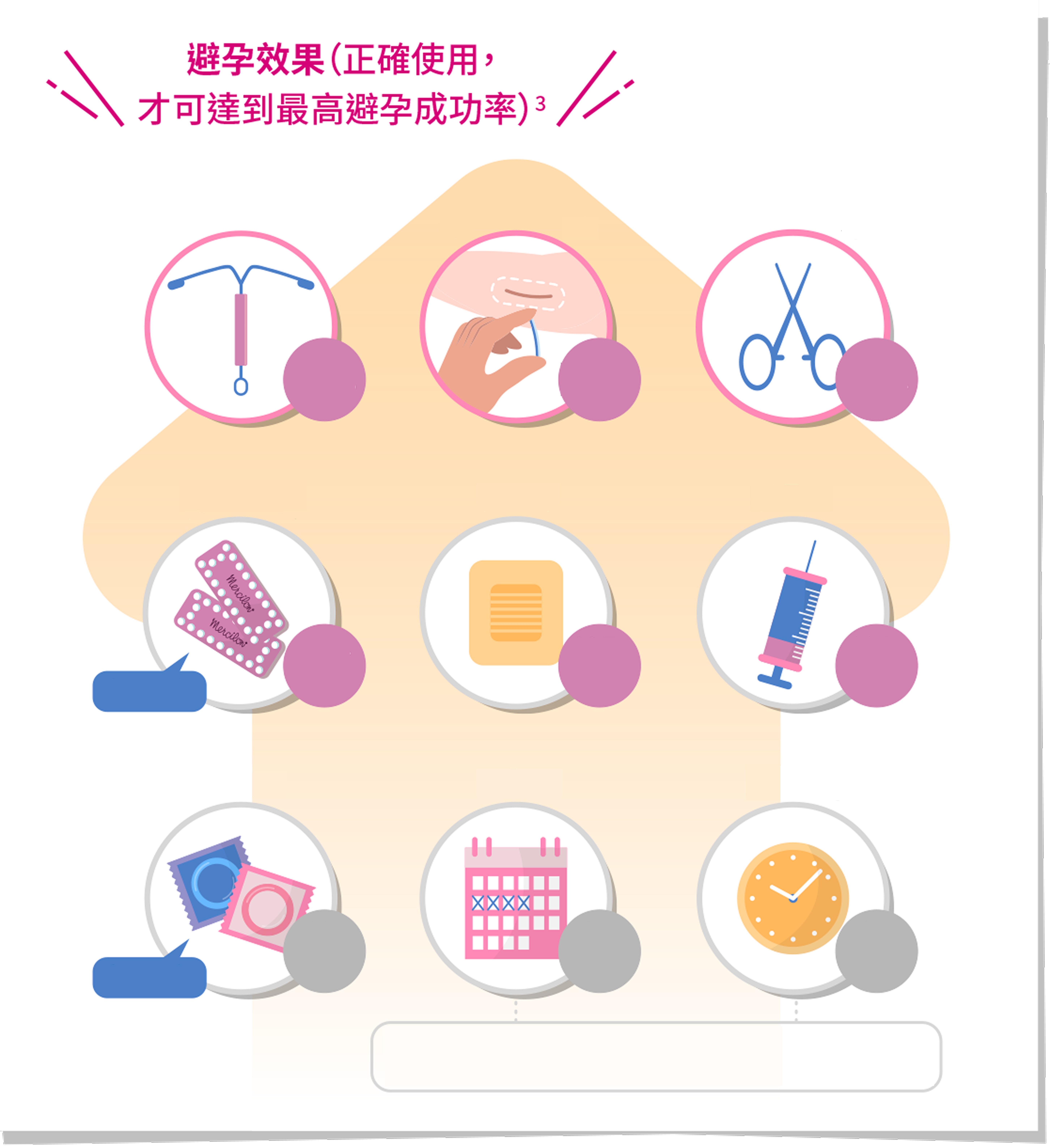 A:如正確使用並規律地服用事前避孕藥,避孕成功率高達99.7%3,避孕效果可與其他避孕方法如藥性子宮環、植入式避孕棒媲美。